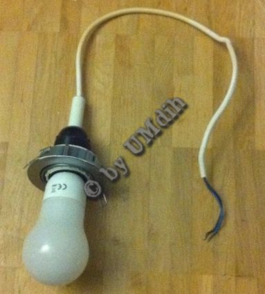 Die E27 Lampenfassung passt prima in die Strahlereinbauhalterung und die Energiesparlampe gibt sich mit 15W zufrieden.
